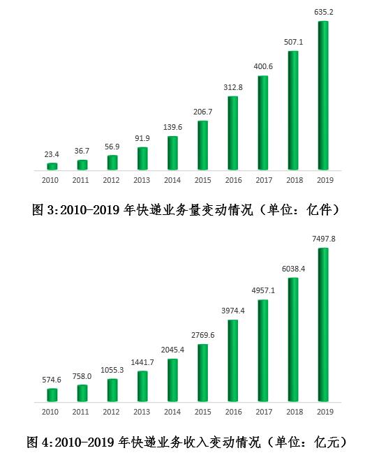 市場(chǎng)規(guī)模中高速增長(zhǎng)。2019年,全國(guó)快遞企業(yè)日均快件處理量超1.7億件,同比增長(zhǎng)25.3%,最高日處理量達(dá)5.4億件,同比增長(zhǎng)28.5%。全國(guó)快遞業(yè)務(wù)量突破600億件,累計(jì)完成635.2億件,同比增長(zhǎng)25.3%,增量規(guī)模連續(xù)兩年超過(guò)100億件??爝f業(yè)務(wù)收入累計(jì)完成7497.8億元,同比增長(zhǎng)24.2%,量收增速差從去年的4.8%進(jìn)一步縮小為1.1%,行業(yè)逐漸由規(guī)模單向驅(qū)動(dòng)向規(guī)模效益雙向驅(qū)動(dòng)轉(zhuǎn)變。與2010年相比,快遞業(yè)務(wù)量收分別增長(zhǎng)了26.1倍和12.0倍,業(yè)務(wù)收入年均復(fù)合增長(zhǎng)率是同期國(guó)內(nèi)生產(chǎn)總值增速的4倍,成為拉動(dòng)經(jīng)濟(jì)增長(zhǎng)的重要?jiǎng)恿Α?/span>