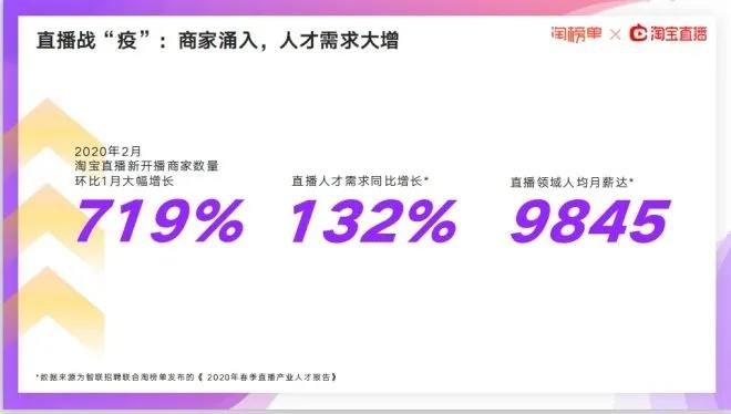 智聯(lián)招聘聯(lián)合淘榜單發(fā)布的《2020年春季直播產(chǎn)業(yè)人才報告》顯示,2020年2月淘寶直播新開播商家數(shù)量環(huán)比1月大幅增長,達(dá)到719%;直播人才需求同比增長132%,直播領(lǐng)域人均月薪達(dá)9845元。